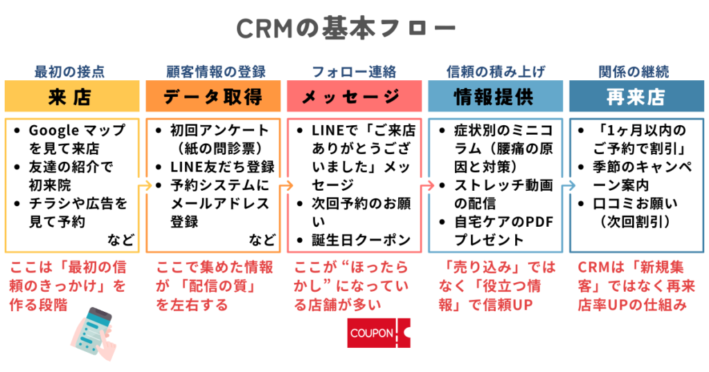 「一度来てくれたお客様と関係性を育てる仕組み」=CRM(顧客管理) が欠かせません。
