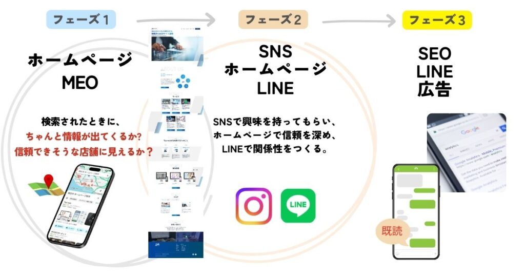 まず最優先で整えたいのは、**ホームページとGoogleマップ(MEO)**です。