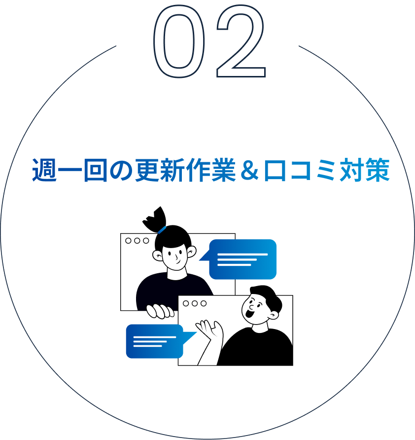 MEOで上位に表示されるためには定期的な更新が必須。 最新情報の更新やイベント告知を週一回行い、Googleマップの情報を常に新鮮な状態に保ちます。また、検索順位をアップさせるために、好意的な口コミが集まりやすい環境を整え、口コミ対策もサポートいたします。